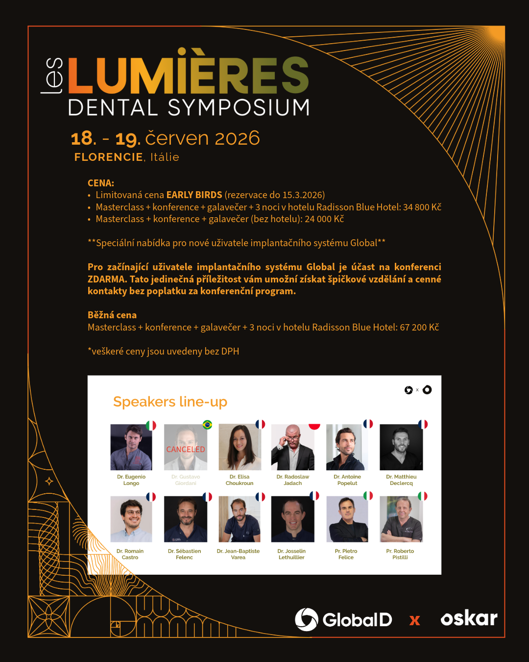 Zveme vás na implantologickou konferenci Conférences des Lumières pořádanou pod záštitou společnosti Global D, která se uskuteční 18.-19.6.2026 ve Florencii.