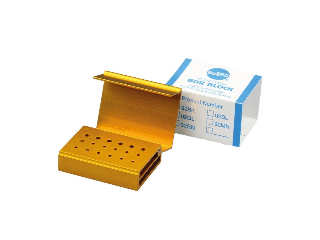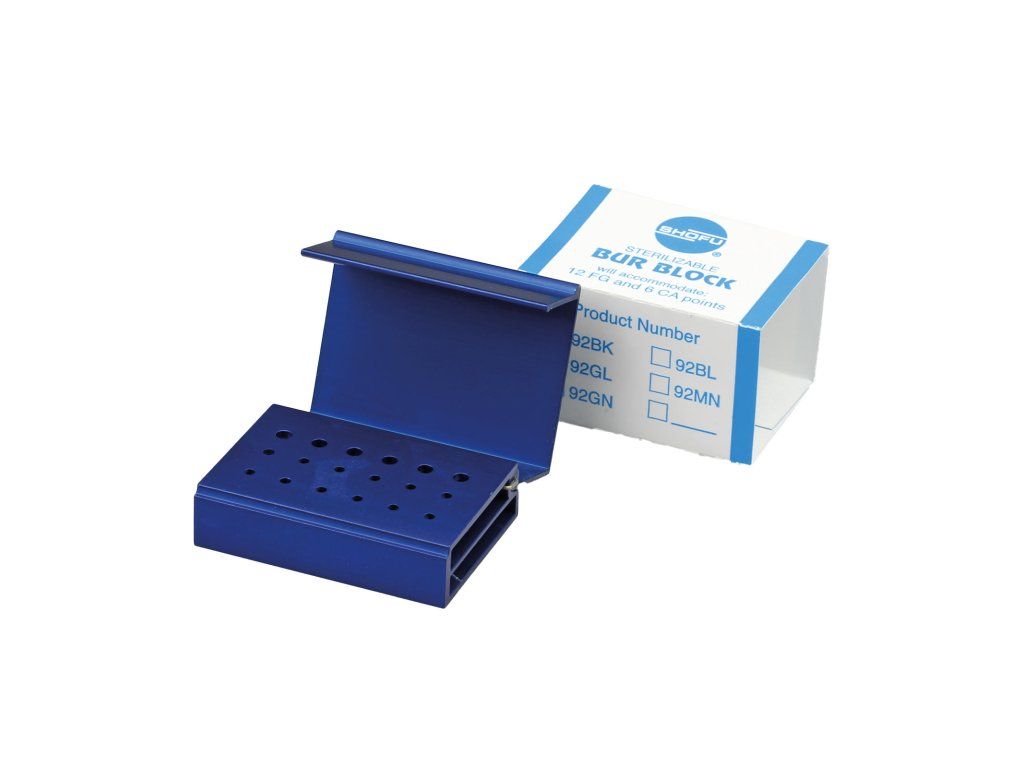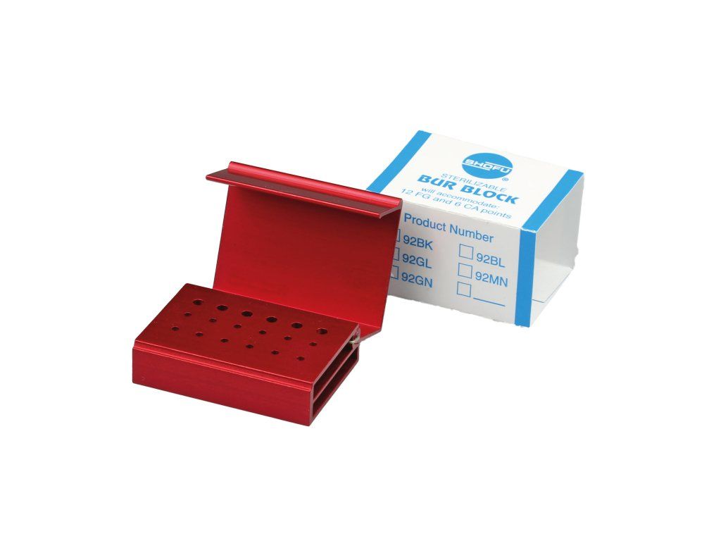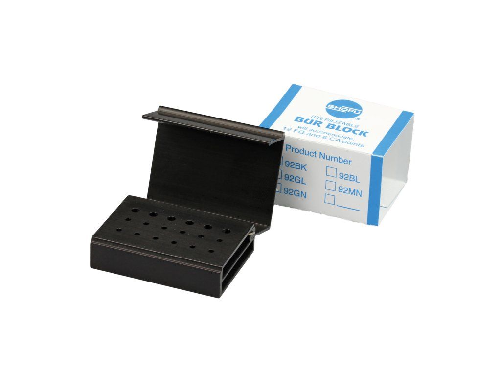 Stojan Bur Block je ideální pro skladování nástrojů s protilehlým úhlem (CA) a třecí rukojetí (FG). Uzamykatelné víko udržuje nástroje ve správném pořadí; otevřené strany zajišťují možnost celkové sterilizace a dezinfekce až 18 nástrojů (12 FG a 6 CA).