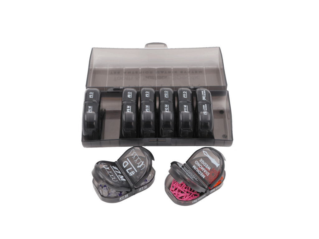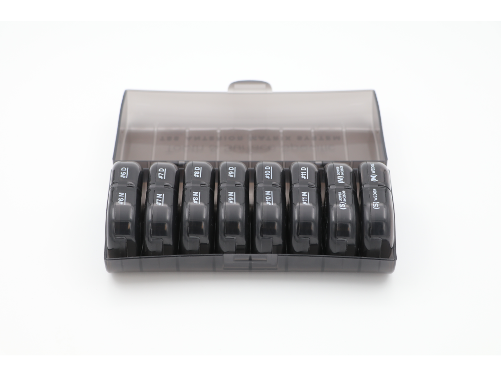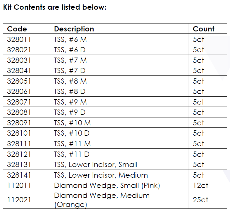 Sada obsahuje matrice indikované pro zuby č. 6-11 (meziální a distální) a univerzální matrice pro malé a střední dolní řezáky. Protože každý zub má jedinečný tvar, umožňují dvě velikosti matric diferenciaci a přizpůsobivost. Malé a střední klínky zajišťují bezpečné umístění a optimální kontakt. Sada TSS Kit zjednodušuje proces zhotovování předních výplní, zkracuje čas strávený na křesle a přináší konzistentní estetické výsledky.